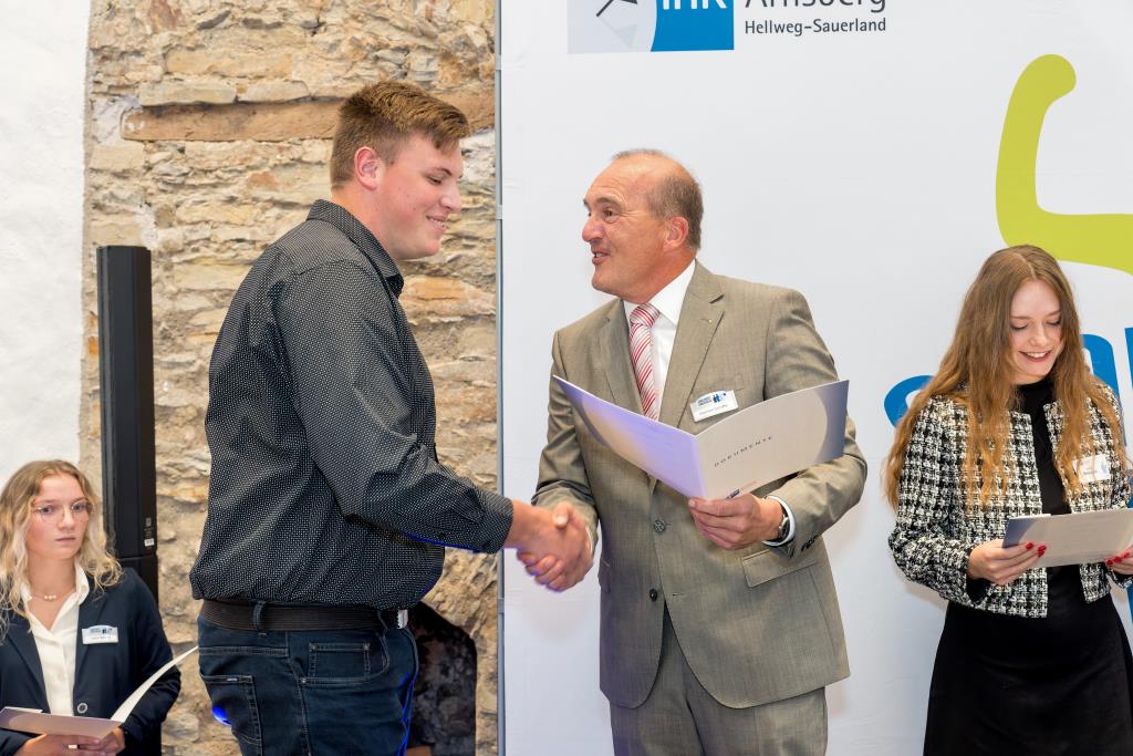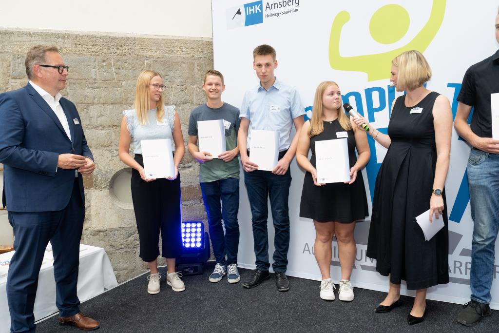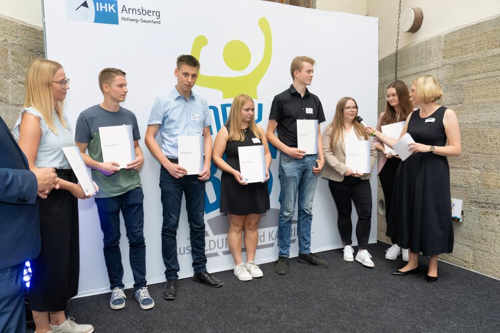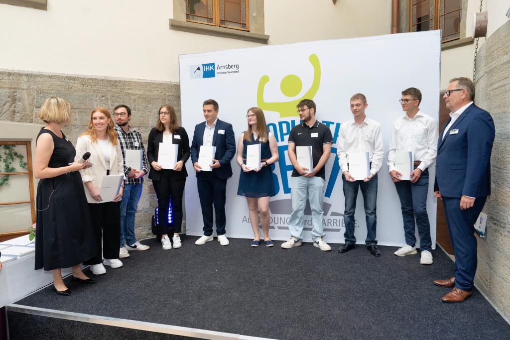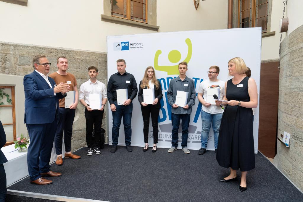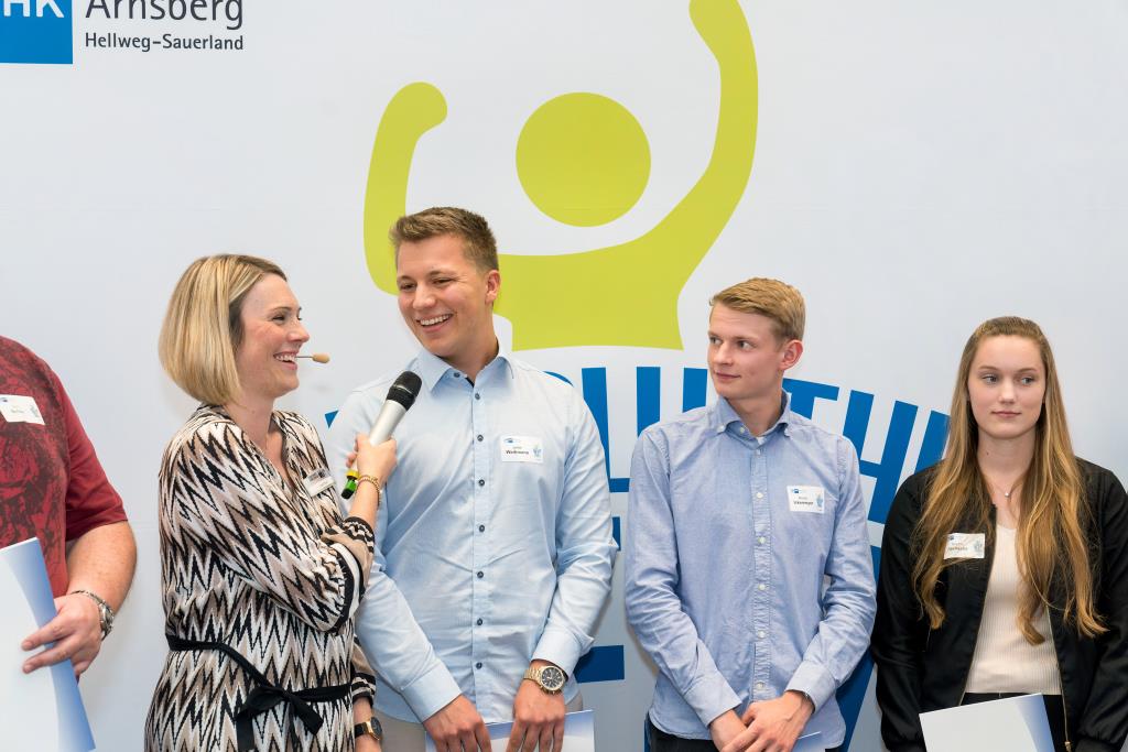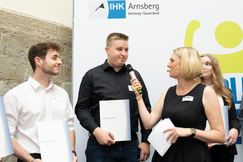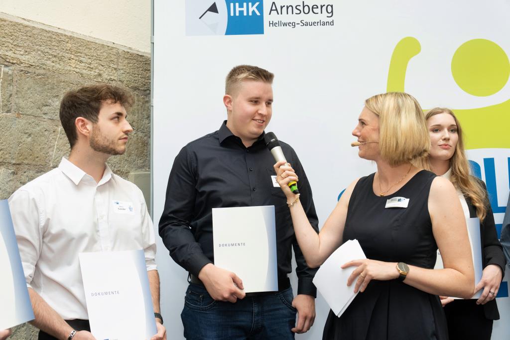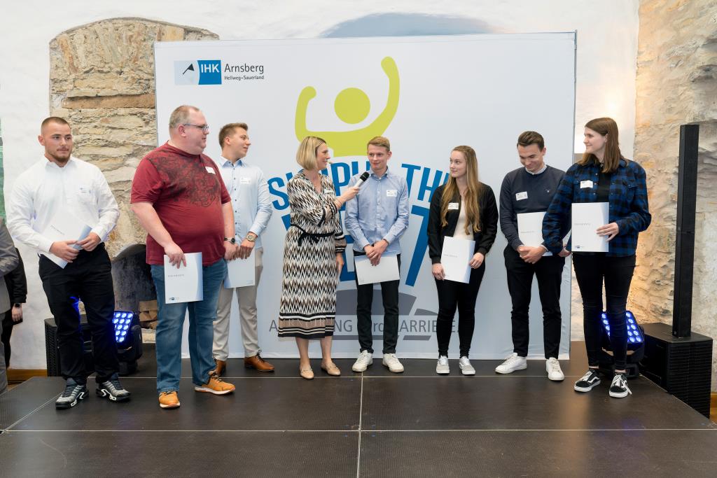 Beide IHK-Vizepräsident hoben zudem hervor, dass die Ausgezeichneten Teil einer erfreulichen Entwicklung seien. Denn jüngste Erhebungen zeigen, dass sich wieder mehr junge Menschen für eine Berufsausbildung als für ein Studium entscheiden. Zu den weiteren Gratulanten gehörten IHK-Hauptgeschäftsführer Jörg Nolte sowie in Herdringen Arnsbergs zweite stellvertretene Bürgermeisterin Margit Hieronymus, die stellvertretende Landrätin Hiltrud Schmidt und die Landtagsabgeordnete Dagmar Hanses und in Störmede Gesekes erste stellvertretende Bürgermeisterin Susanne Schulte Döinghaus und die stellvertretende Landrätin Heike Kruse. Die Veranstaltung moderierte IHK-Mitarbeiterin Lisa Plum. Sie entlockte in kleinen Gesprächsrunden den Absolventen viele Anekdoten aus ihrer Ausbildung und zu ihren Zukunftsplänen.