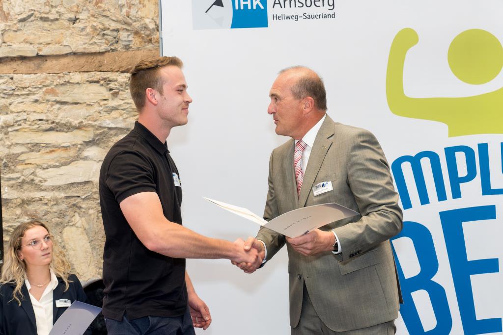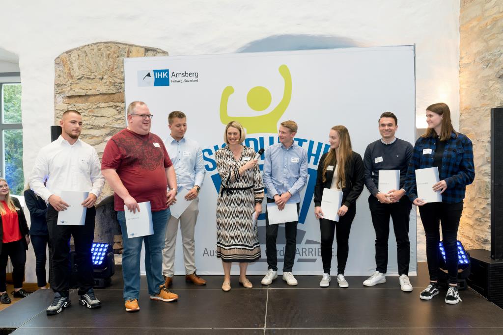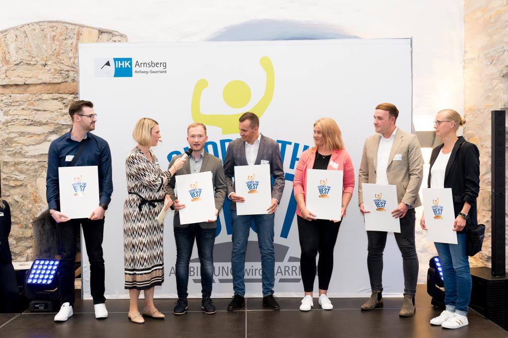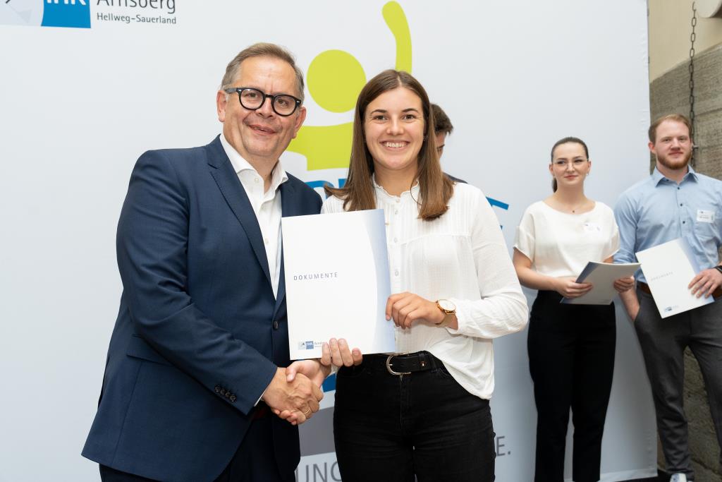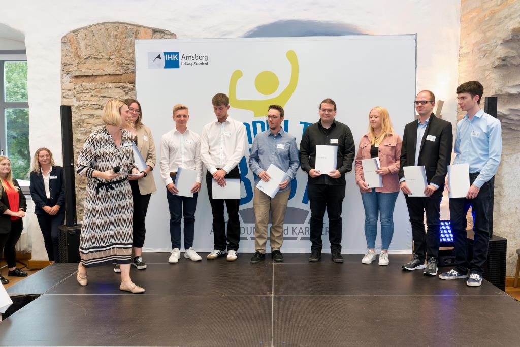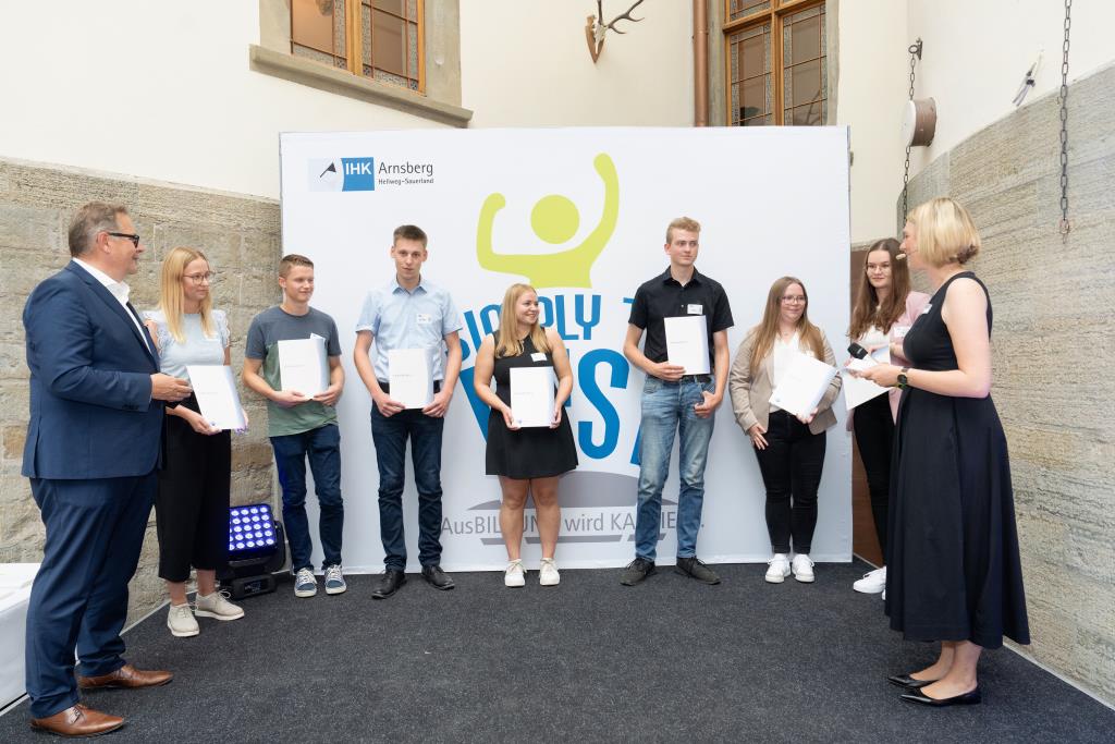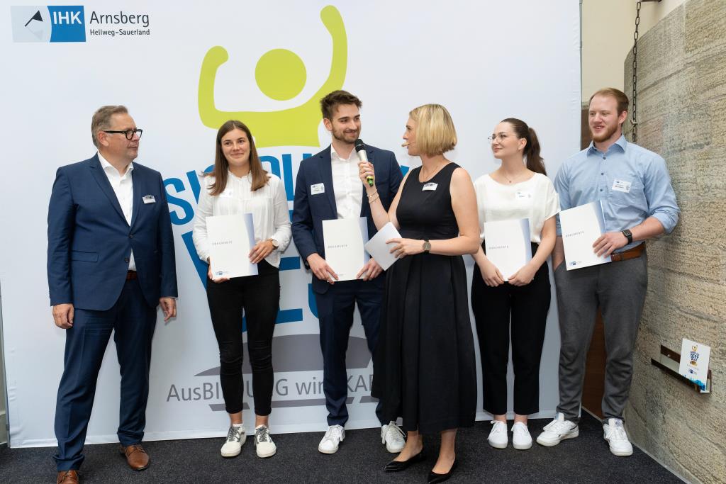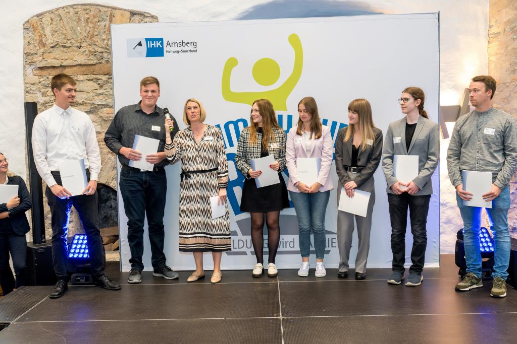 Beide IHK-Vizepräsident hoben zudem hervor, dass die Ausgezeichneten Teil einer erfreulichen Entwicklung seien. Denn jüngste Erhebungen zeigen, dass sich wieder mehr junge Menschen für eine Berufsausbildung als für ein Studium entscheiden. Zu den weiteren Gratulanten gehörten IHK-Hauptgeschäftsführer Jörg Nolte sowie in Herdringen Arnsbergs zweite stellvertretene Bürgermeisterin Margit Hieronymus, die stellvertretende Landrätin Hiltrud Schmidt und die Landtagsabgeordnete Dagmar Hanses und in Störmede Gesekes erste stellvertretende Bürgermeisterin Susanne Schulte Döinghaus und die stellvertretende Landrätin Heike Kruse. Die Veranstaltung moderierte IHK-Mitarbeiterin Lisa Plum. Sie entlockte in kleinen Gesprächsrunden den Absolventen viele Anekdoten aus ihrer Ausbildung und zu ihren Zukunftsplänen.