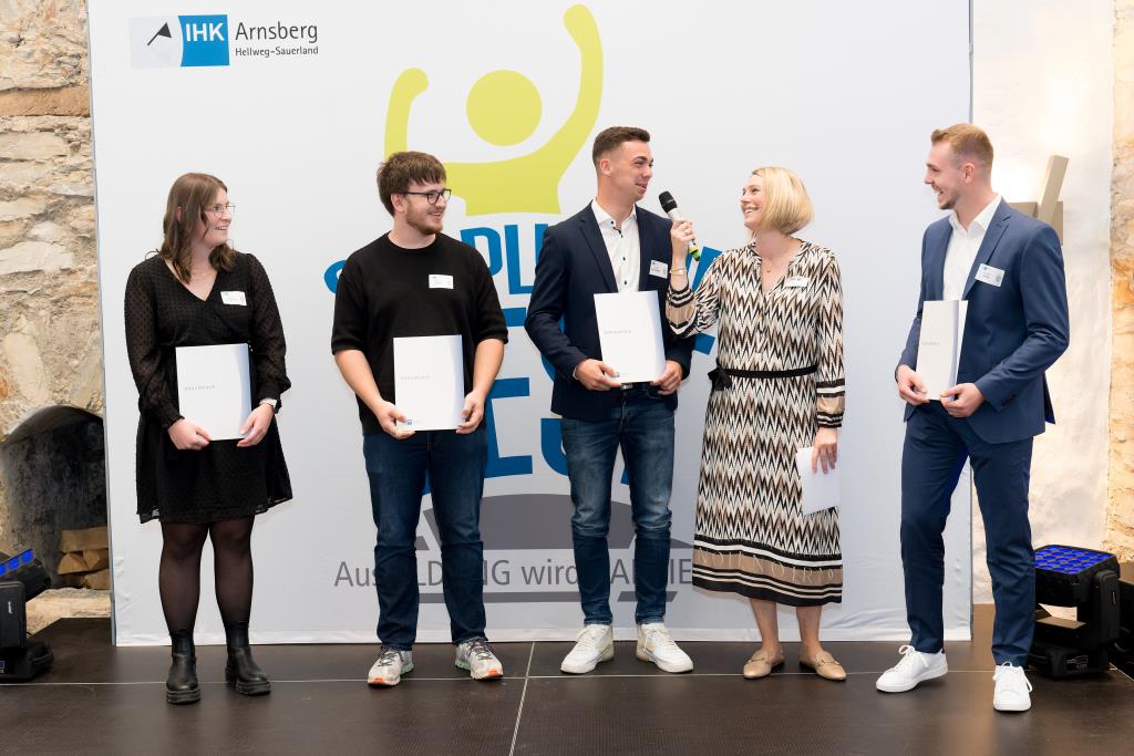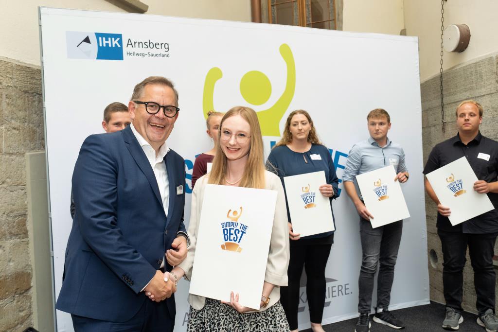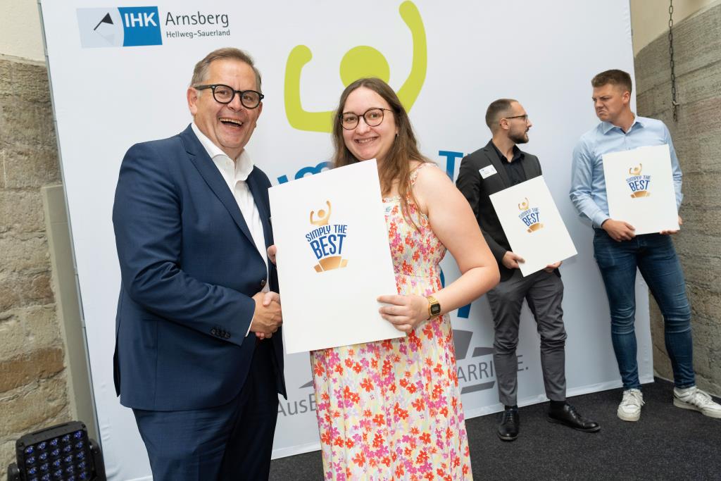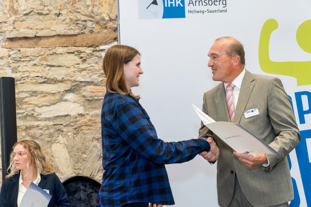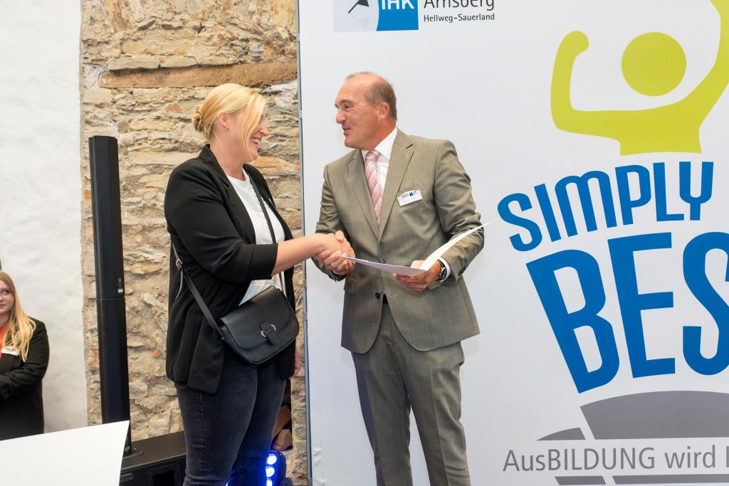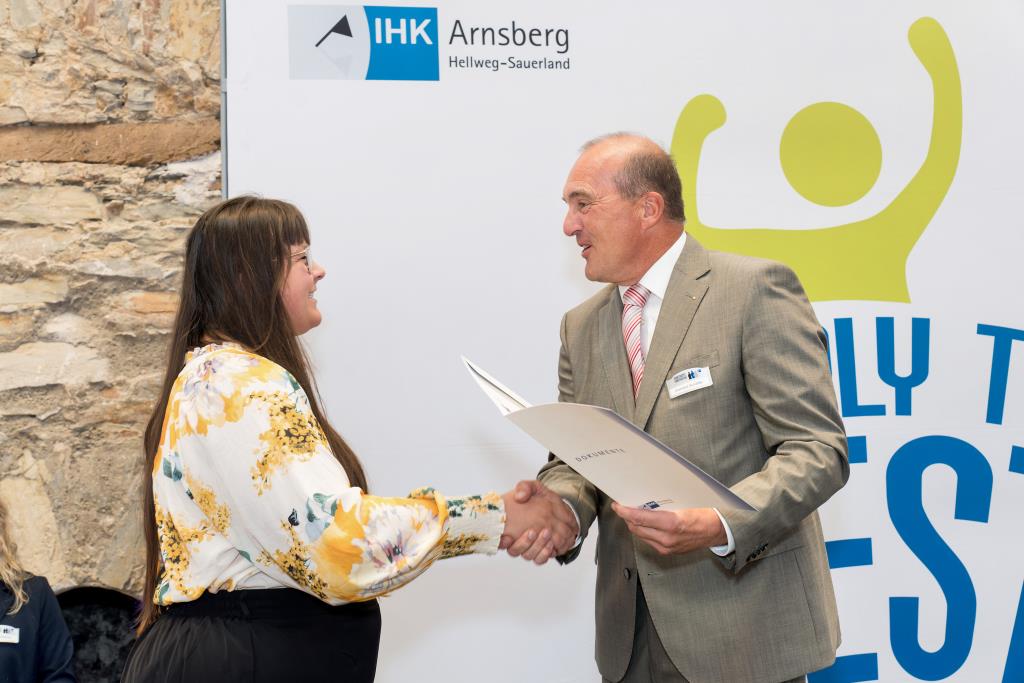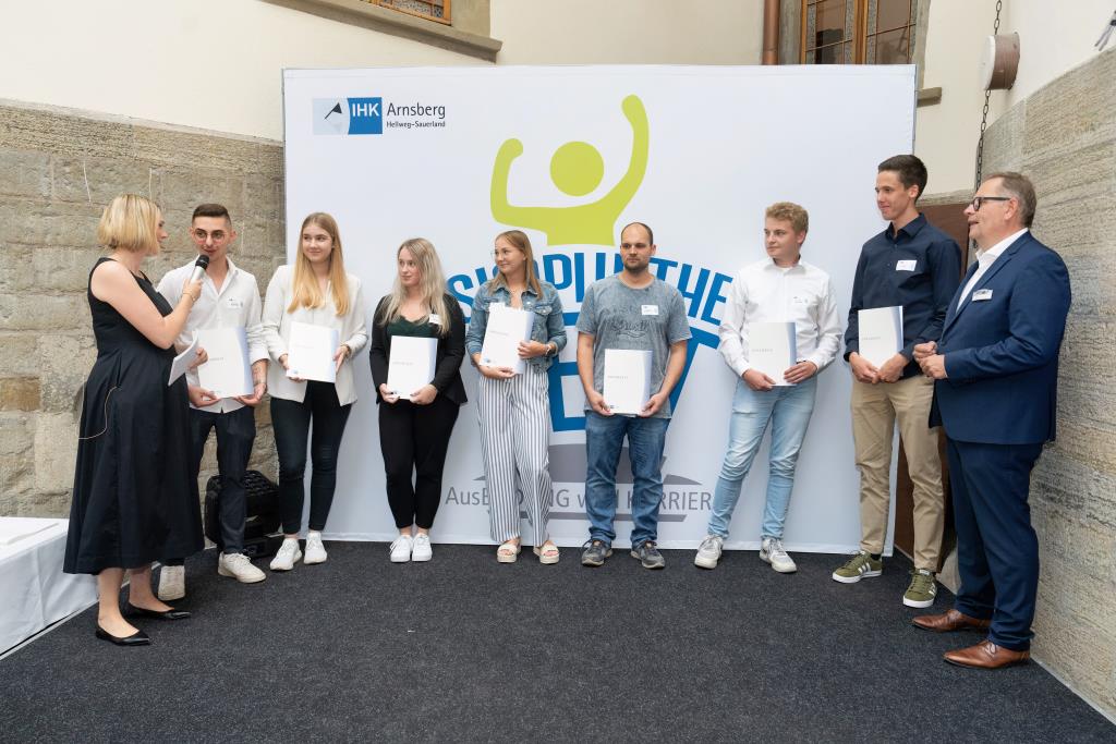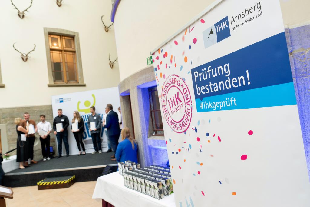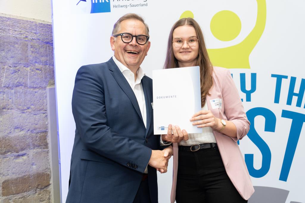 Beide IHK-Vizepräsident hoben zudem hervor, dass die Ausgezeichneten Teil einer erfreulichen Entwicklung seien. Denn jüngste Erhebungen zeigen, dass sich wieder mehr junge Menschen für eine Berufsausbildung als für ein Studium entscheiden. Zu den weiteren Gratulanten gehörten IHK-Hauptgeschäftsführer Jörg Nolte sowie in Herdringen Arnsbergs zweite stellvertretene Bürgermeisterin Margit Hieronymus, die stellvertretende Landrätin Hiltrud Schmidt und die Landtagsabgeordnete Dagmar Hanses und in Störmede Gesekes erste stellvertretende Bürgermeisterin Susanne Schulte Döinghaus und die stellvertretende Landrätin Heike Kruse. Die Veranstaltung moderierte IHK-Mitarbeiterin Lisa Plum. Sie entlockte in kleinen Gesprächsrunden den Absolventen viele Anekdoten aus ihrer Ausbildung und zu ihren Zukunftsplänen.