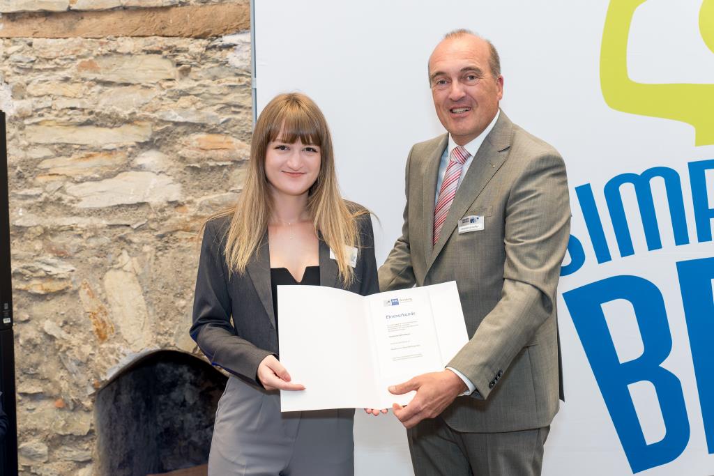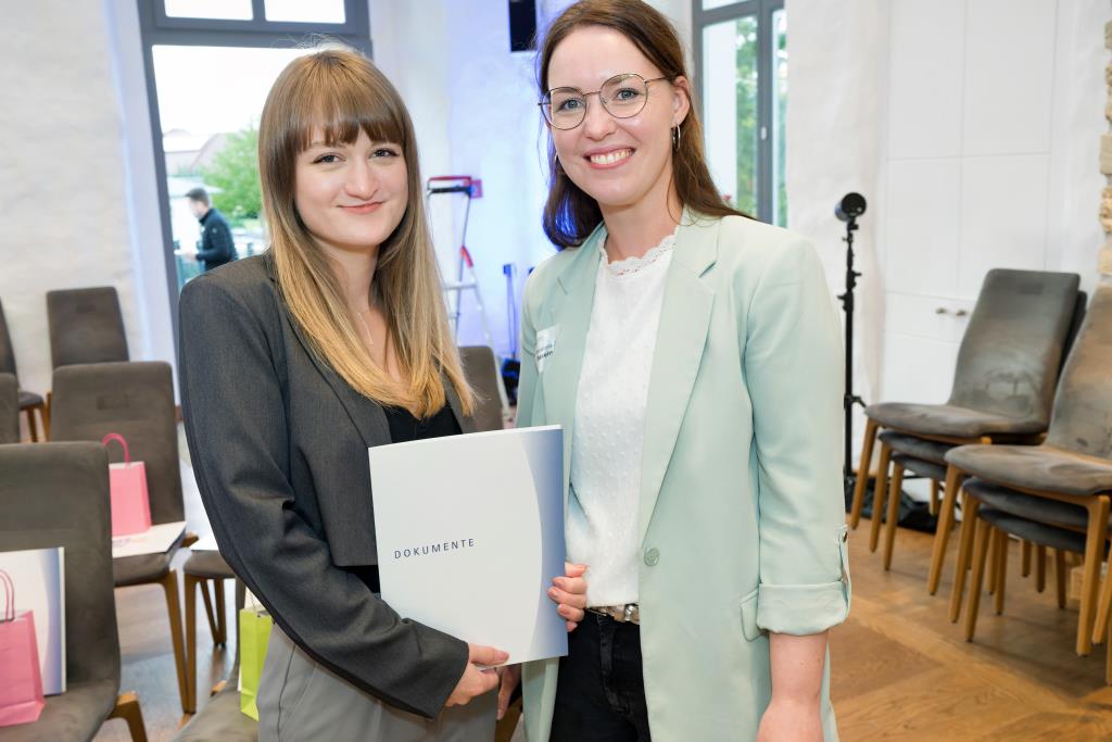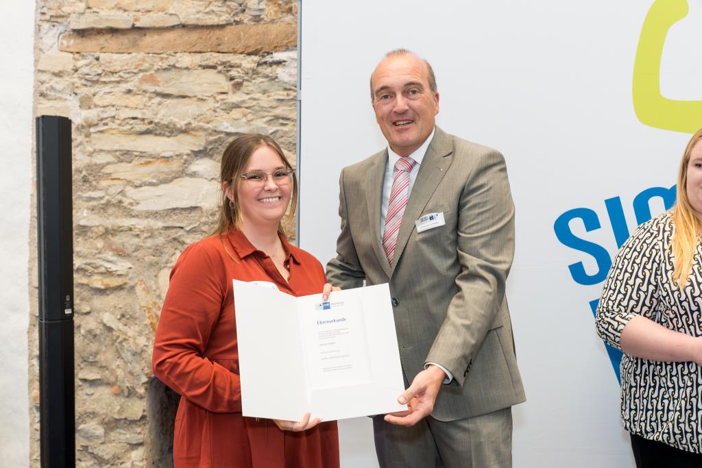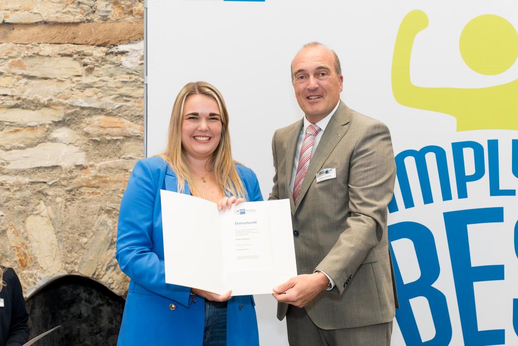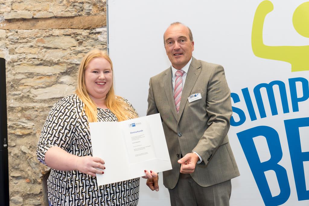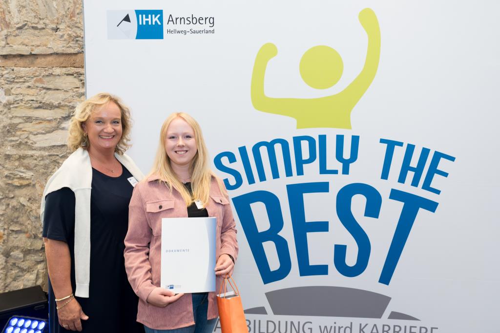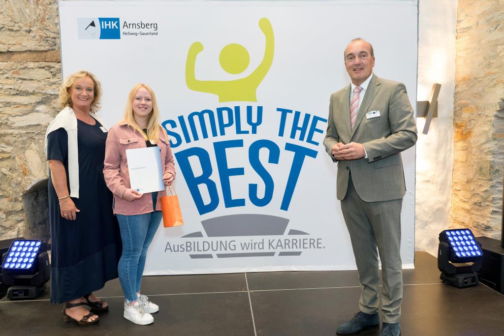 Eine anstrengende Lernzeit hat auch Alina Pionke hinter sich. Sie gehört zu den besten Weiterbildungsabsolventen und ist nun geprüfte Bilanzbuchhalterin/ Bachelor Professional in Bilanzbuchhaltung. Alina Pionke hat 2019 eine Ausbildung zur Steuerfachangestellte abgeschlossen. Seit 2020 arbeitet sie bei der ISM Heinrich Krämer GmbH & Co. KG in Lippstadt in der Buchhaltung. Hier stieg der Bedarf an Fachexpertise in den Bereichen Jahresabschluss und Controlling. Das war der Anlass für sie, berufsbegleitend, das heißt in einem Crashkurs mit je zwei Abenden pro Woche Online-Kursen, die Weiterbildung zur Bilanzbuchhalterin zu machen. „Das war sehr herausfordernd und mit viel Lernaufwand verbunden, denn in allen Fächern war Können gefragt“, berichtet sie. Damit die Weiterbildung in so kurzer Zeit ein Erfolg wurde, hatte sie eine Verabredung mit ihrem Arbeitgeber. Sie investierte den ganzen Jahresurlaub und einen Bildungsurlaub in die Prüfungsvorbereitung. Dass sich die Anstrengung auszahlt, zeigt nicht nur die Ehrung als eine der Besten. Auch im Unternehmen wird ihr zusätzliches Können als Ansprechpartnerin für steuerliche Fragen und im Controlling geschätzt. „Ich bekomme sehr viel mit und kann im Unternehmen Erfahrungen sammeln und wachsen“, stellt sie heraus.