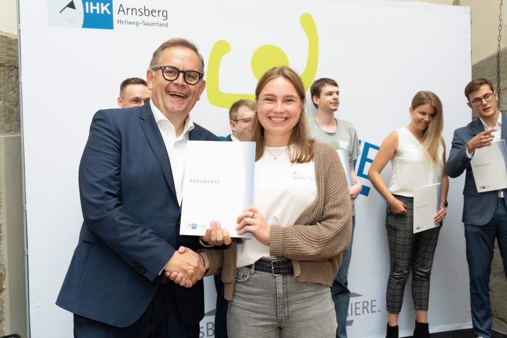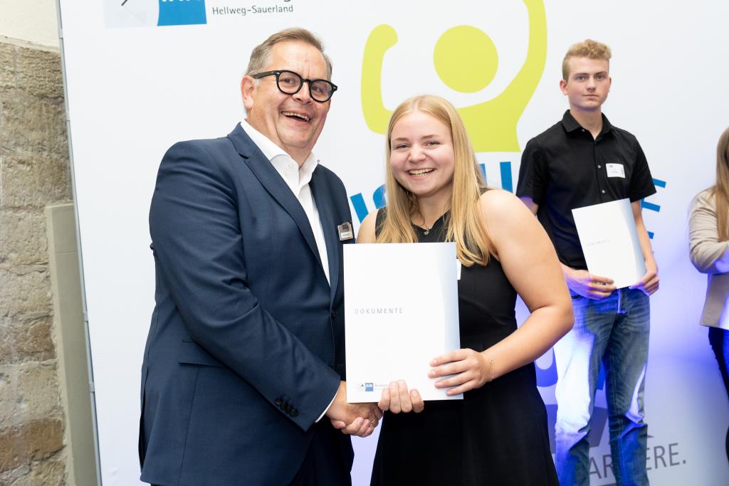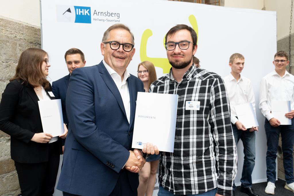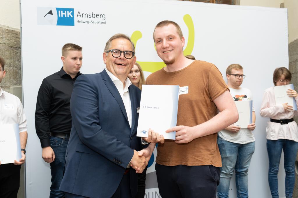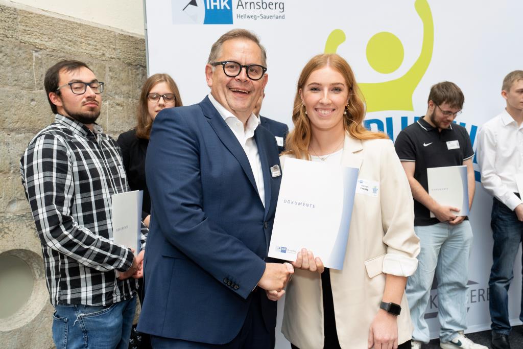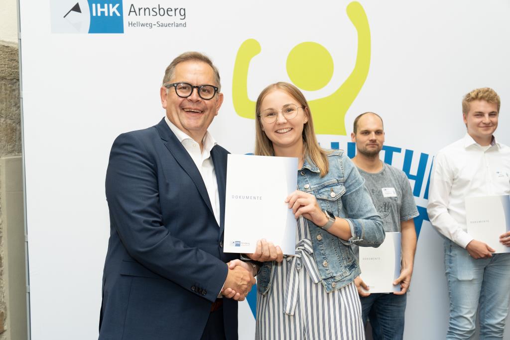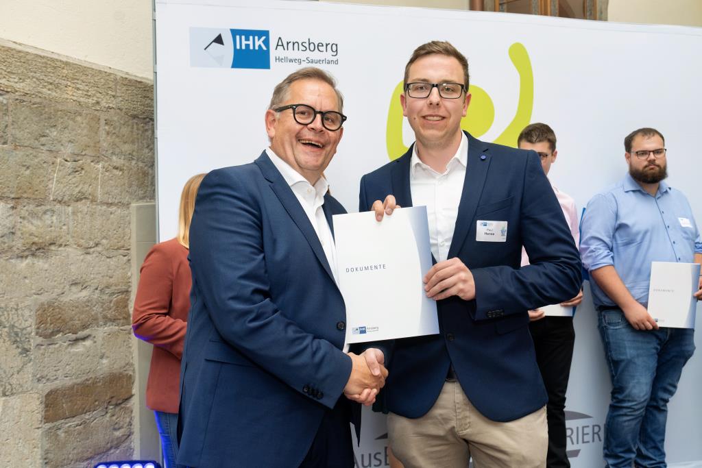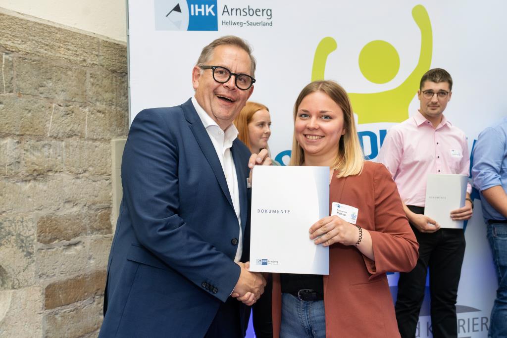 Insgesamt 111 Auszubildende sowie 38 Weiterbildungsabsolventen aus dem Hochsauerlandkreis und dem Kreis Soest hat die IHK für ihre hervorragenden Leistungen ausgezeichnet. Sie haben in ihren Abschlussprüfungen 92 Punkte oder mehr geholt und erhielten aus den Händen der IHK-Vizepräsidenten Andreas Knappstein und Ekkehart Schieffer ihre Ehrenurkunde.