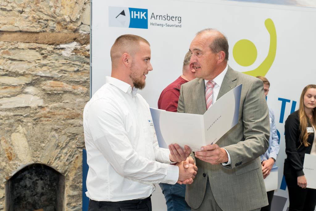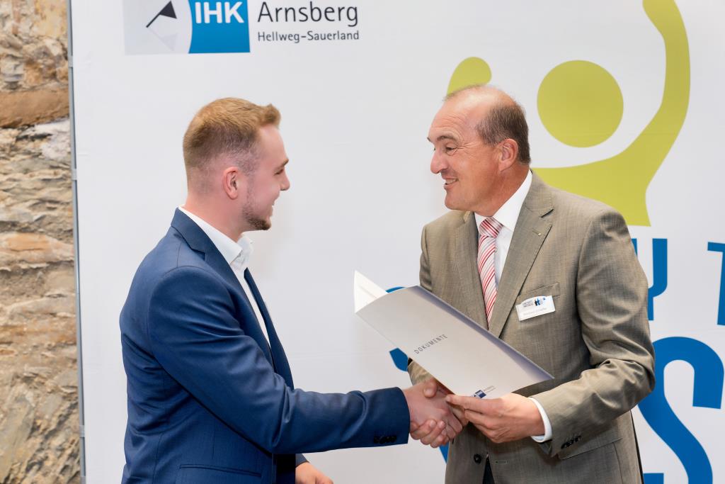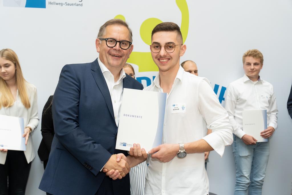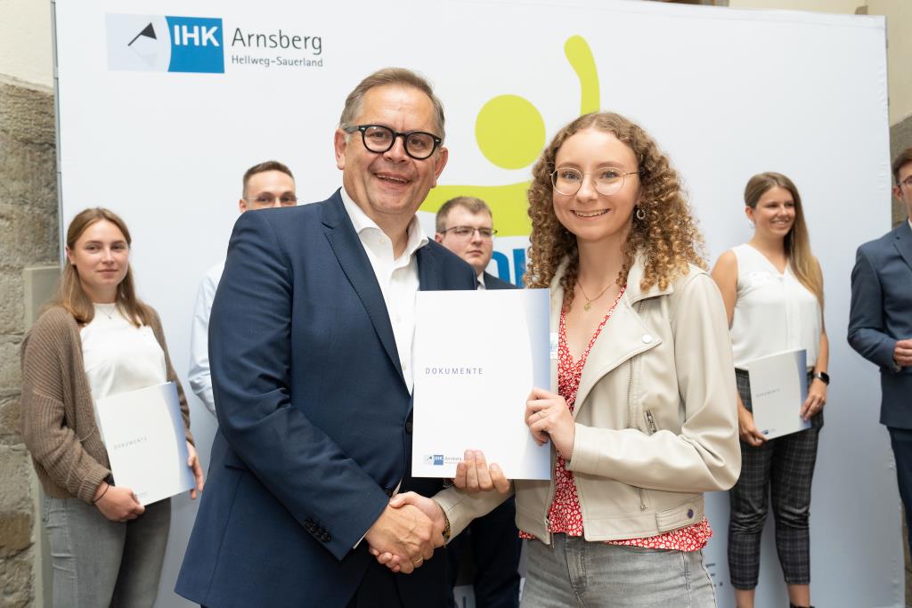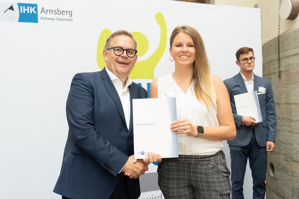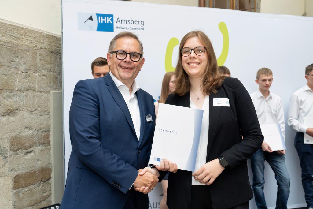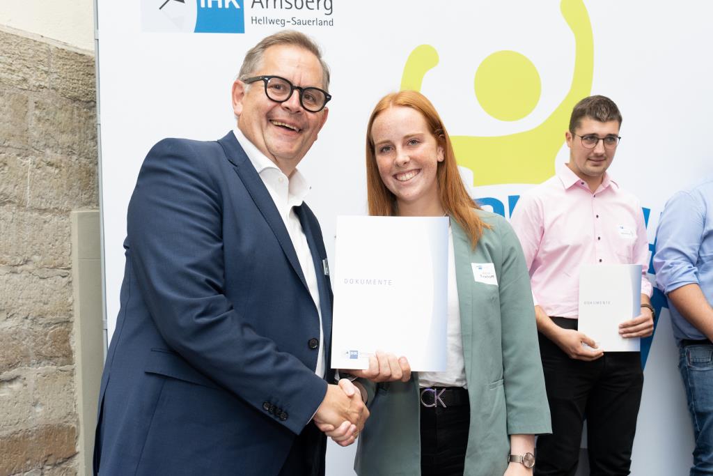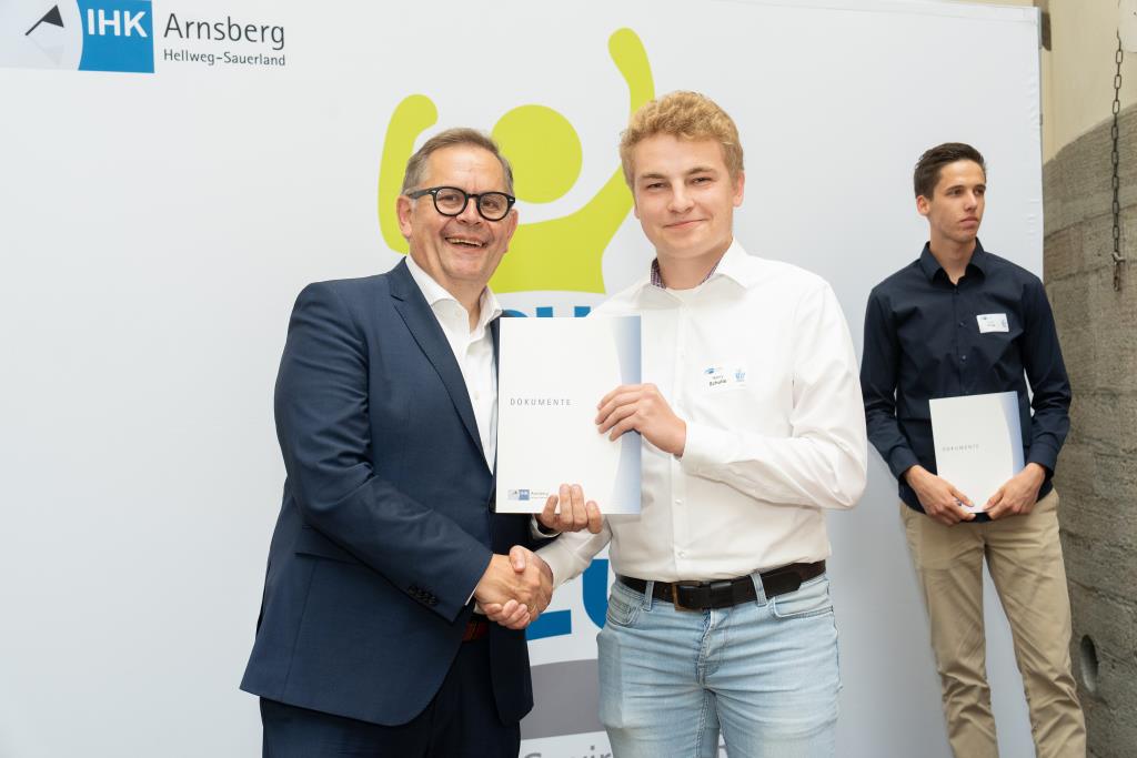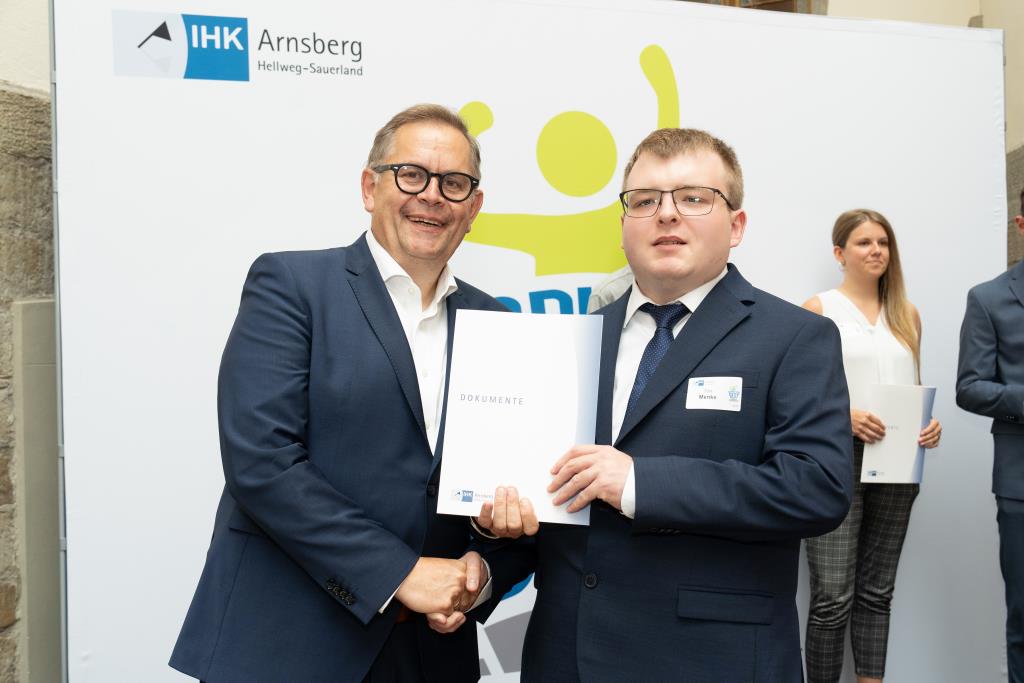 Insgesamt 111 Auszubildende sowie 38 Weiterbildungsabsolventen aus dem Hochsauerlandkreis und dem Kreis Soest hat die IHK für ihre hervorragenden Leistungen ausgezeichnet. Sie haben in ihren Abschlussprüfungen 92 Punkte oder mehr geholt und erhielten aus den Händen der IHK-Vizepräsidenten Andreas Knappstein und Ekkehart Schieffer ihre Ehrenurkunde.