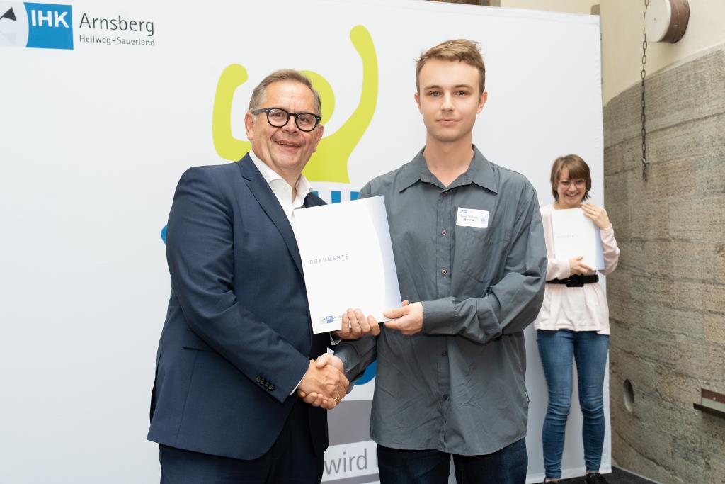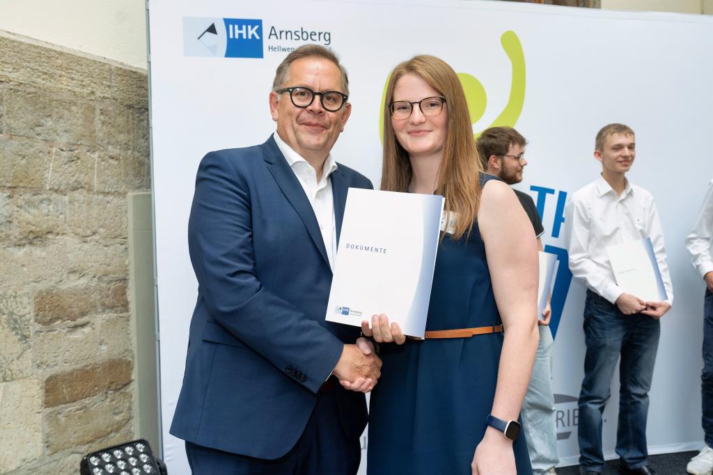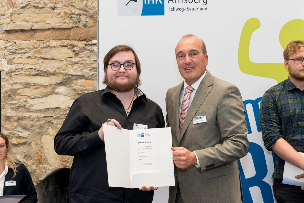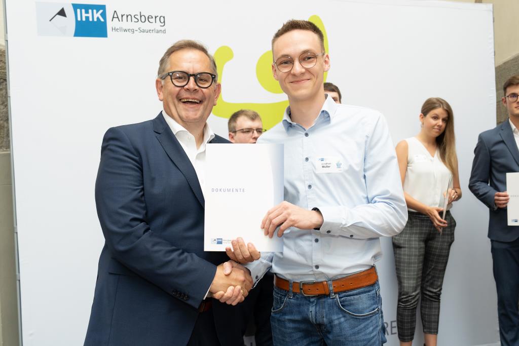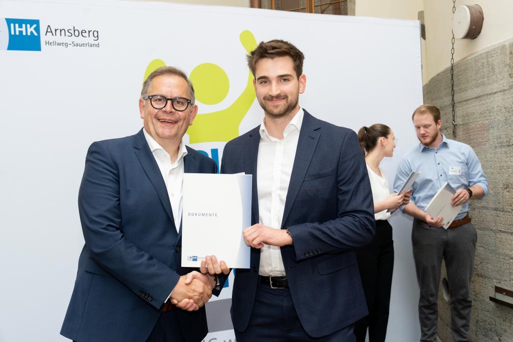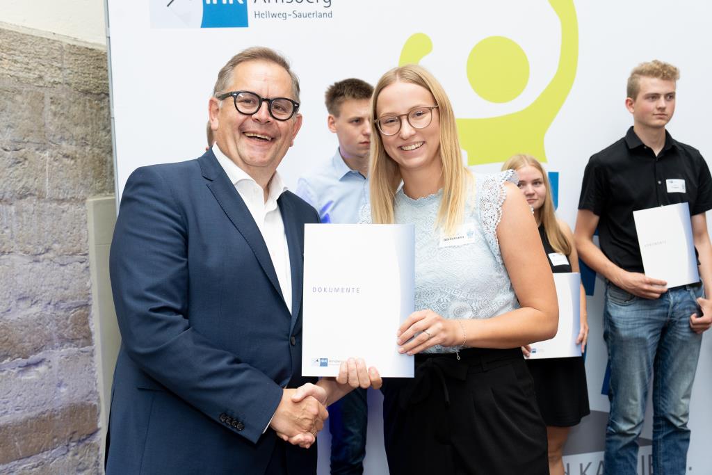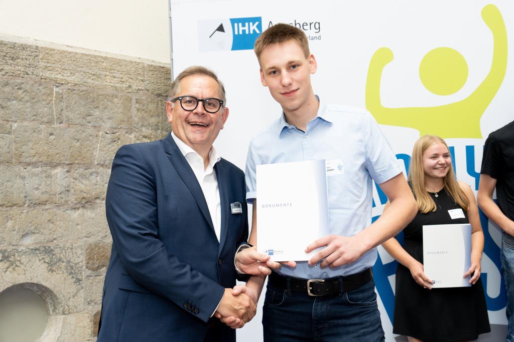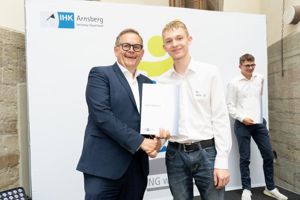 Insgesamt 111 Auszubildende sowie 38 Weiterbildungsabsolventen aus dem Hochsauerlandkreis und dem Kreis Soest hat die IHK für ihre hervorragenden Leistungen ausgezeichnet. Sie haben in ihren Abschlussprüfungen 92 Punkte oder mehr geholt und erhielten aus den Händen der IHK-Vizepräsidenten Andreas Knappstein und Ekkehart Schieffer ihre Ehrenurkunde.