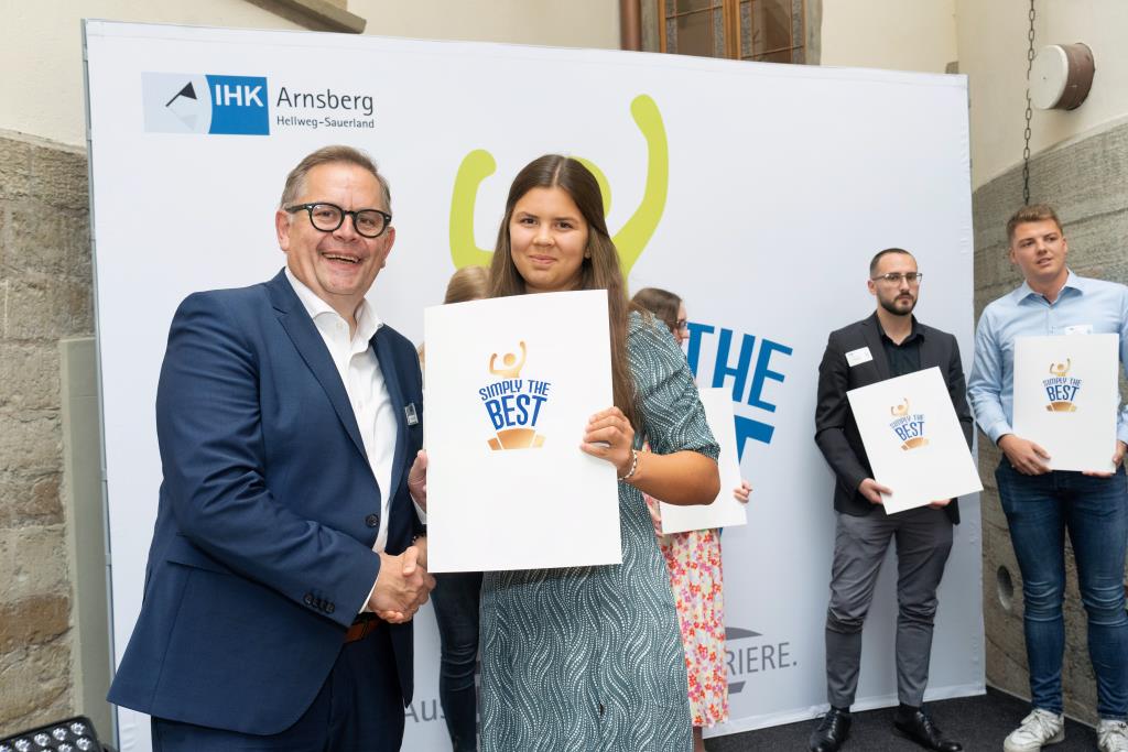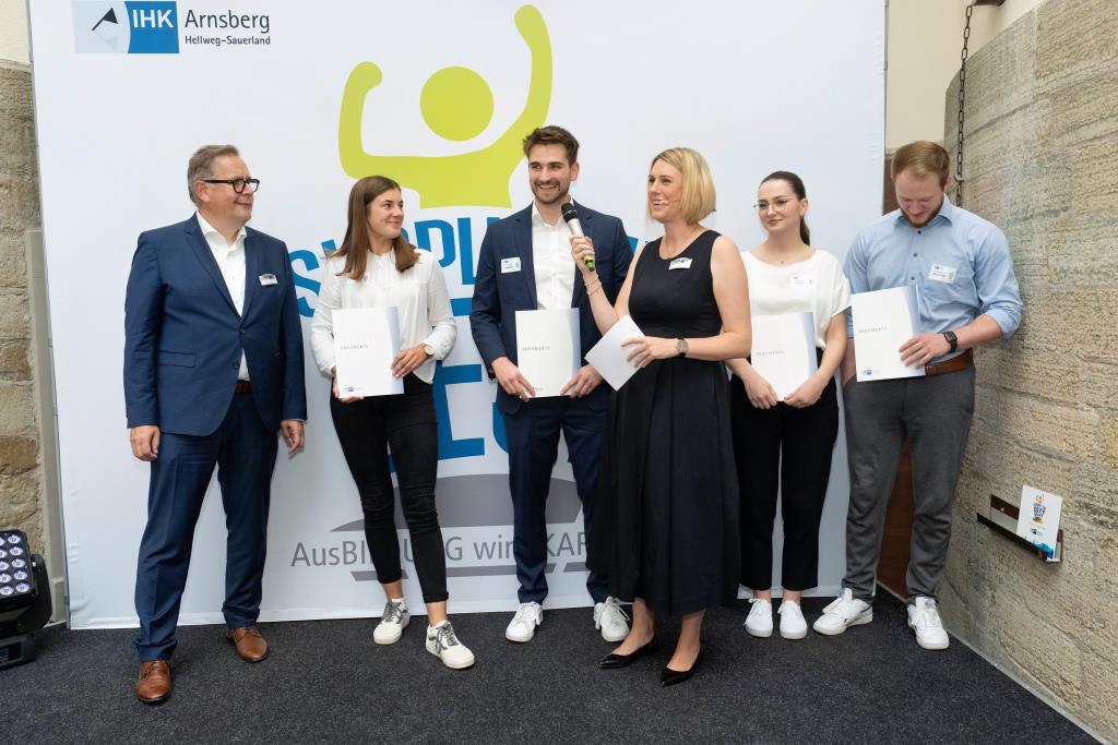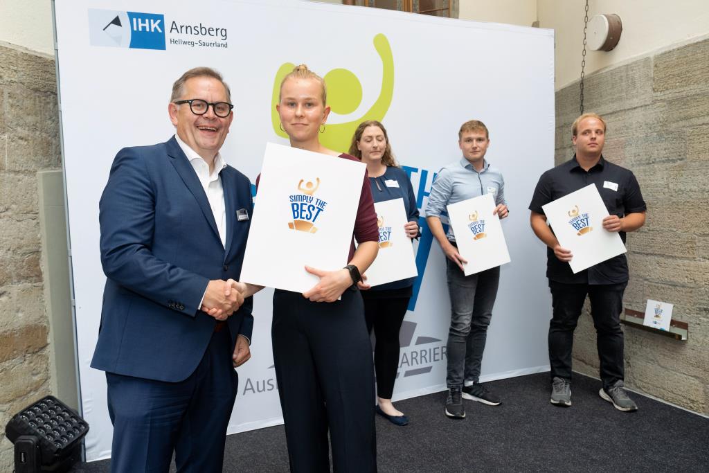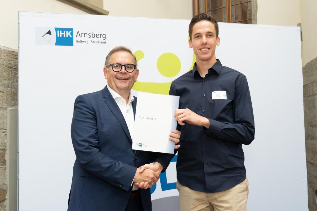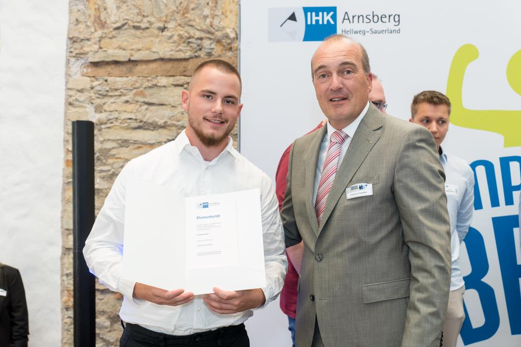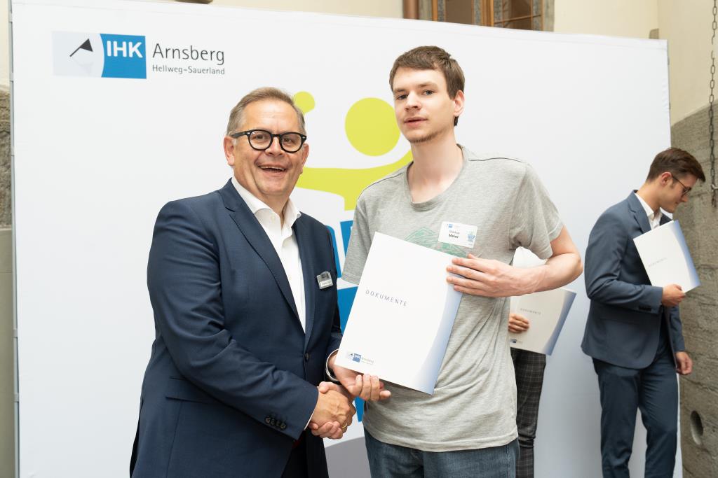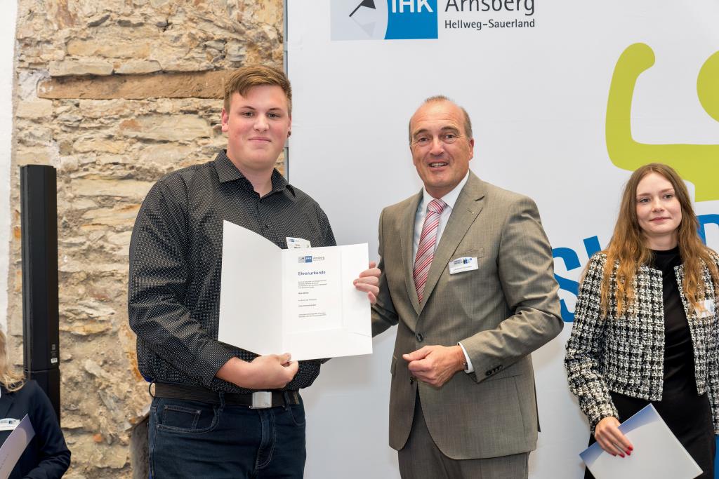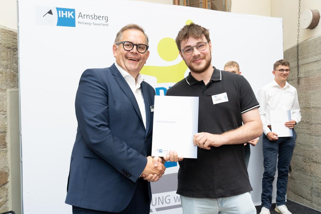Insgesamt 111 Auszubildende sowie 38 Weiterbildungsabsolventen aus dem Hochsauerlandkreis und dem Kreis Soest hat die IHK für ihre hervorragenden Leistungen ausgezeichnet. Sie haben in ihren Abschlussprüfungen 92 Punkte oder mehr geholt und erhielten aus den Händen der IHK-Vizepräsidenten Andreas Knappstein und Ekkehart Schieffer ihre Ehrenurkunde.