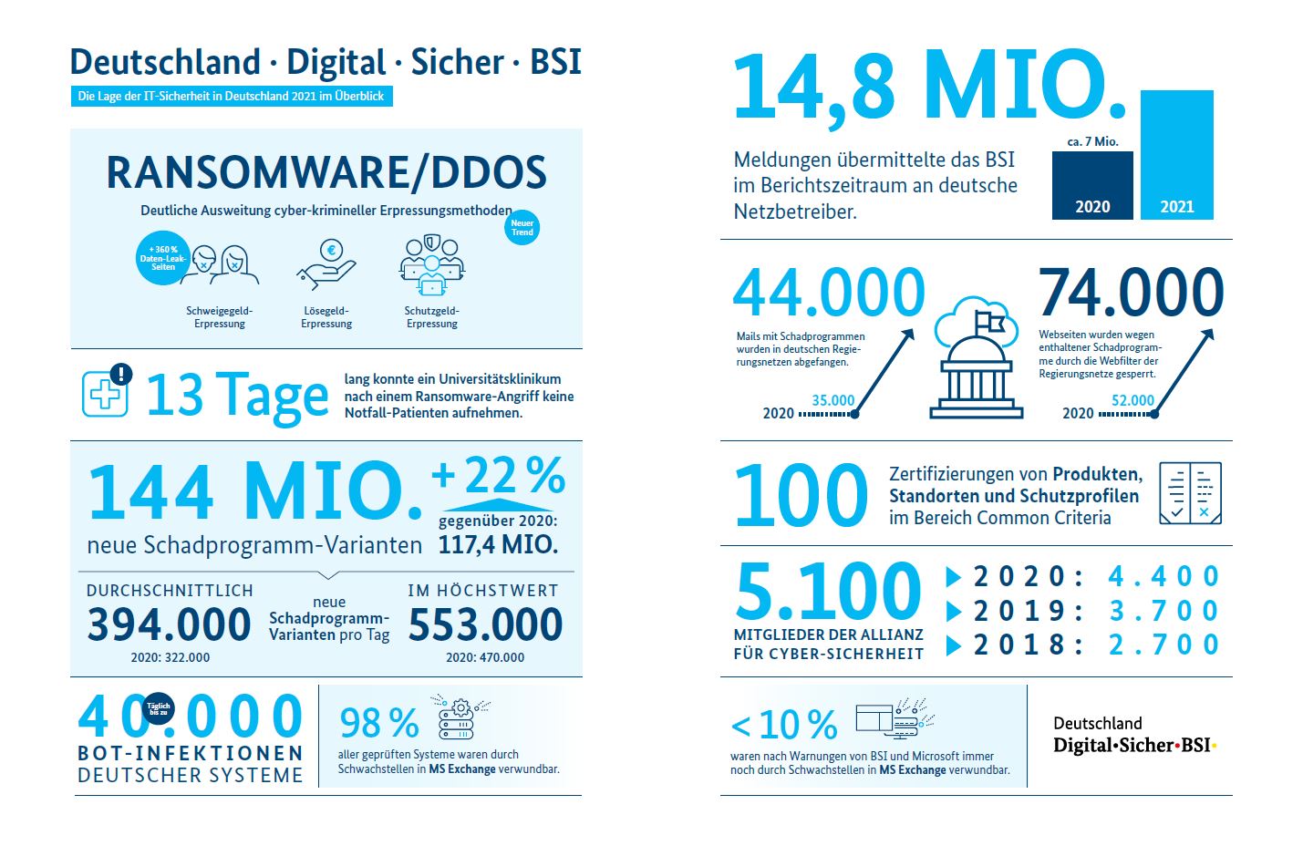 "Es ist nicht nur die Anzahl von Sicherheitsvorfällen, die besorgniserregend ist, es ist auch die rasante Entwicklung neuer und angepasster Angriffsmethoden, die massenhafte Ausnutzung schwerwiegender Software-Schwachstellen und die teilweise gravierenden Folgen, die erfolgreiche Cyber-Angriffe auslösen", so Präsident des Bundesamts für Sicherheit in der Informationstechnik Arne Schönbohm im Vorwort des Berichts zur Lage der IT-Sicherheit in Deutschland 2021. Dem Bericht ist auch zu entnehmen, das mit 14,8 Mio. gemeldeten Schadprogramm-Infektionen die Zahl sich gegenüber dem Vorjahr verdoppelt hat.