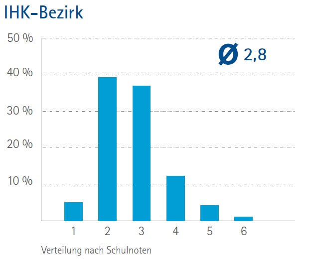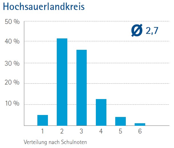 Die Unternehmen der Region Hellweg-Sauerland bewerten ihren Standort im Durchschnitt befriedigend – mit einer Note von 2,8 im Schulnotensystem. 45 Prozent vergeben die Noten „gut“ oder „sehr gut“. Hinsichtlich der beiden Landkreise gibt es nur geringfügige Unterschiede in der Bewertung (Kreis Soest 2,8; Hochsauerlandkreis 2,7). Die Entwicklung des Standortes in den letzten fünf Jahren wird mehrheitlich als konstant wahrgenommen.