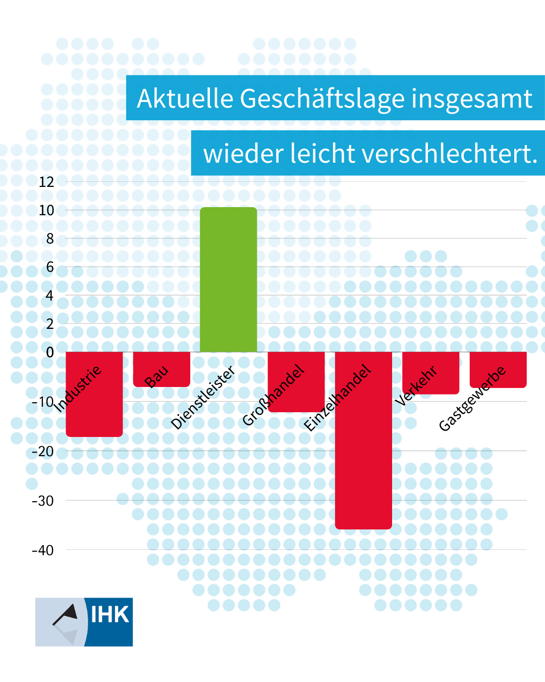 „Angesichts der aktuellen weltwirtschaftlichen Verwerfungen sind seriöse Prognosen kaum zu treffen. Der Wunsch zur Besserung ist stärker ausgeprägt, als dieses in der Wirklichkeit umzusetzen ist“, ordnet IHK-Präsident Andreas Knappstein die Umfrageergebnisse ein. Unter den Bedingungen im Umfrage-Zeitraum (24. März bis 4. April) gaben sich die Unternehmen etwas weniger pessimistisch gestimmt als zuvor. Dennoch bleiben die Erwartungen und die Lage weiterhin im roten Bereich. Lediglich 18 Prozent der Betriebe bewerten ihre derzeitige Lage als gut, 29 Prozent als schlecht. Der daraus resultierende negative Lagesaldo (-12 Punkte) zeigt eine, wenn auch nur leichte, Verschlechterung im Vergleich zum Jahresbeginn (-2 Punkte). Besonders deutlich fällt der Rückgang in den Branchen Einzelhandel (Verschlechterung um -26 Punkte auf -36 Punkte), Verkehr (-27 Punkte) und Bau (-16 Punkte) aus. Einziger Lichtblick ist der Dienstleistungssektor, der als einzige Branche einen positiven Lagesaldo meldet und sich leicht verbessern konnte. In der Industrie ist die Lage (-17 Punkte) weiter kritisch, aber verbessert gegenüber Jahresbeginn.