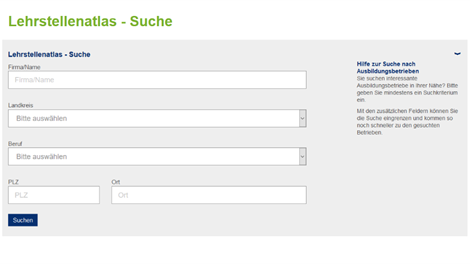 Der Ausbildungsatlas bietet eine Datenbank der Ausbildungsbetriebe in der Region Hellweg-Sauerland. Die Aufteilung der Berufe in den Berufsfeldern erfolgt analog der Berufsfeldersystematik im KAoA Prozess. Die Ergebnisse lassen sich ausdrucken oder via Mail ganz einfach zusenden.